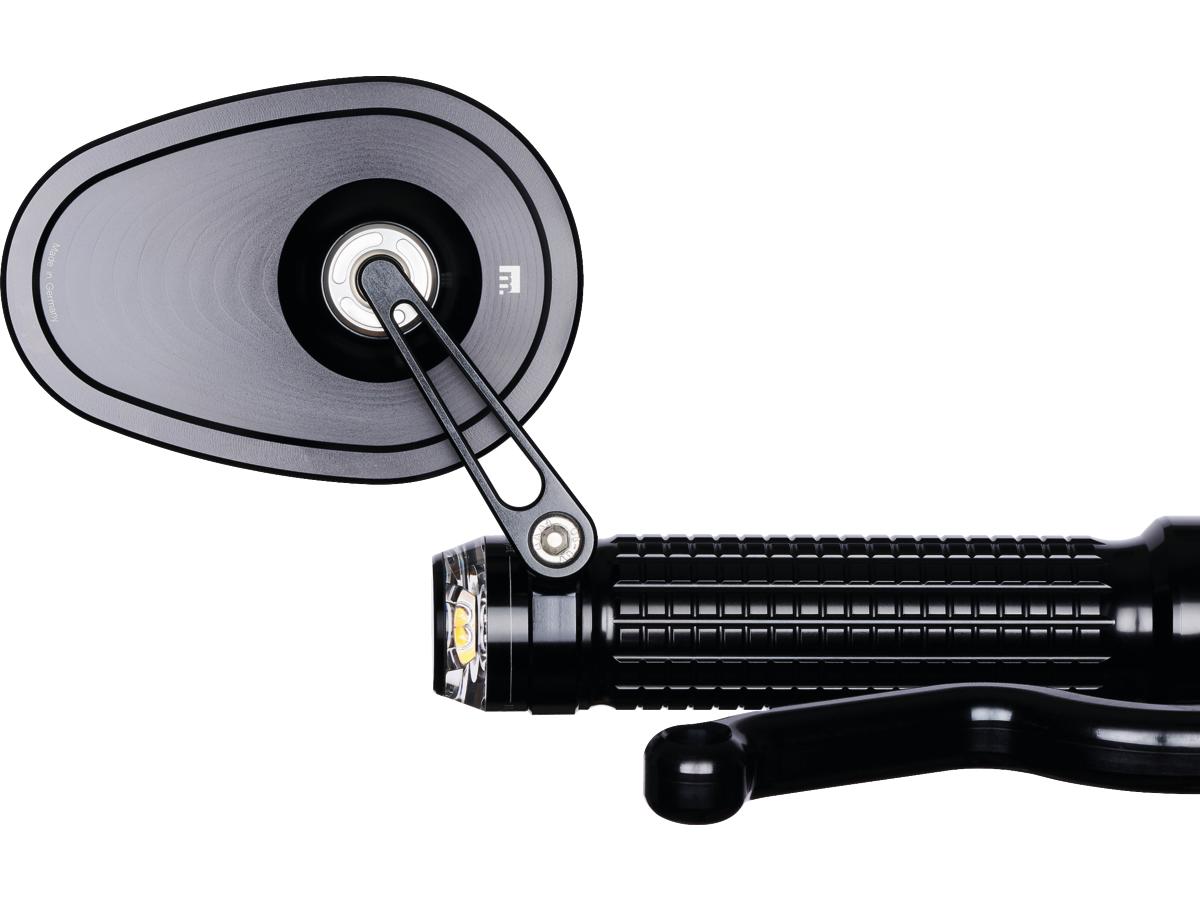 motogadget now exclusively presents its glassless mirror series mo.view. The special feature of this motorcycle mirror is the patented mirror surface, which is worked directly into the metal of the body. The Aluminium itself is the mirror surface. A weightless design without edge and frame is possible and the mirror body itself becomes very thin and light.