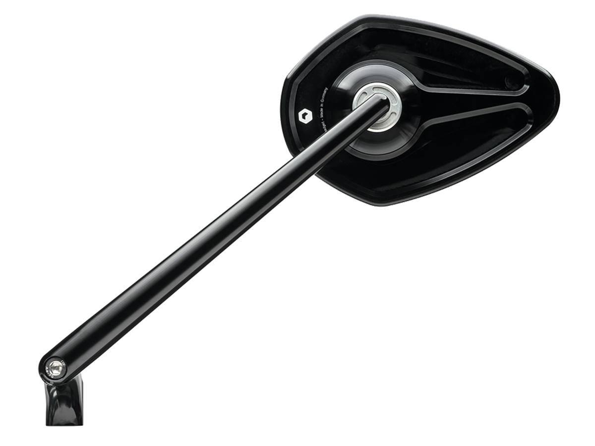 The mirror body, mirror arm and the clamping for the handlebar end are milled on CNC machines from solid aluminium and anodized to a high quality. All screws are made of stainless steel. The precise ball joint allows a comfortable and very stable adjustment of the mirror.