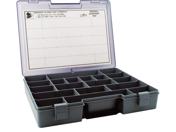 Il vassoio dell'assortimento contiene 16 misure di dadi a corona bassa UNC o UNF. Può essere riordinato in confezioni individuali di 5 o 10 per dimensioni selezionate.