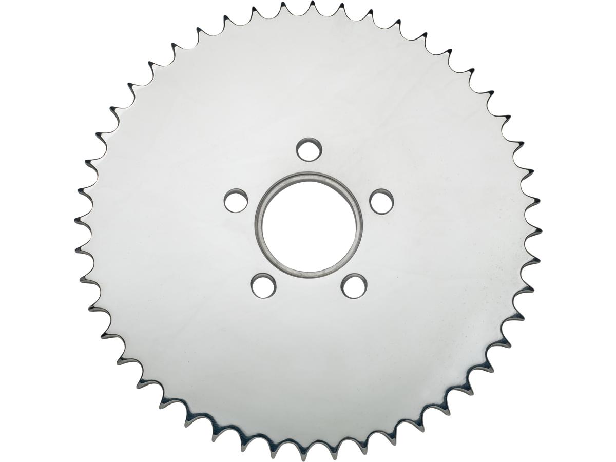 I pignoni RevTech per il lato sinistro sono piatti e forati per lo schema di bulloni OEM Harley-Davidson con un registro i.d. da 2,22 pollici per applicazioni 00-16 e includono un anello riduttore da 1,985 pollici per l'installazione su applicazioni 84-99. Lavorati in alluminio 7075 T6 di grado aeronautico e progettati per l'uso con la catena 530.