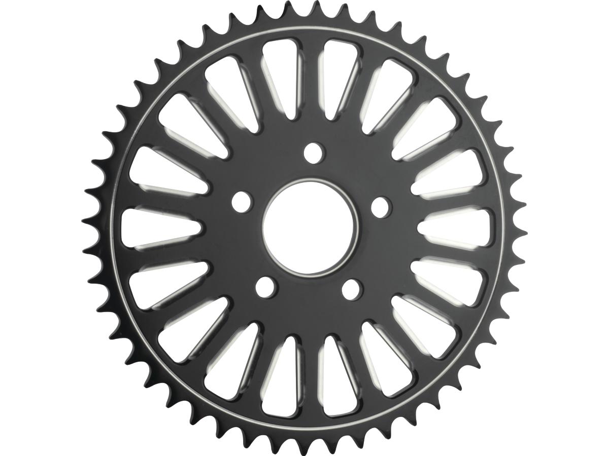 I pignoni RevTech per il lato sinistro sono piatti e forati per lo schema di bulloni OEM Harley-Davidson con un registro i.d. da 2,22 pollici per applicazioni 00-16 e includono un anello riduttore da 1,985 pollici per l'installazione su applicazioni 84-99. Lavorati da alluminio 7075 T6 di grado aeronautico e progettati per l'uso con la catena 530.